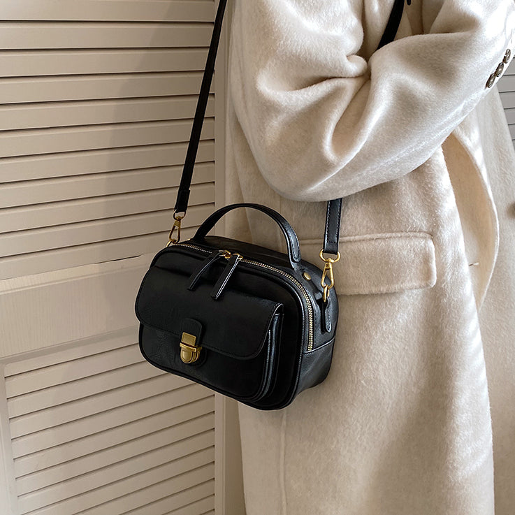 Notes: Sling bag. Top handle. Adjustable shoulder strap. Zip closure. Front pocket with flap and metal closure. Inside pocket with zipper. Rustic gold hardware.